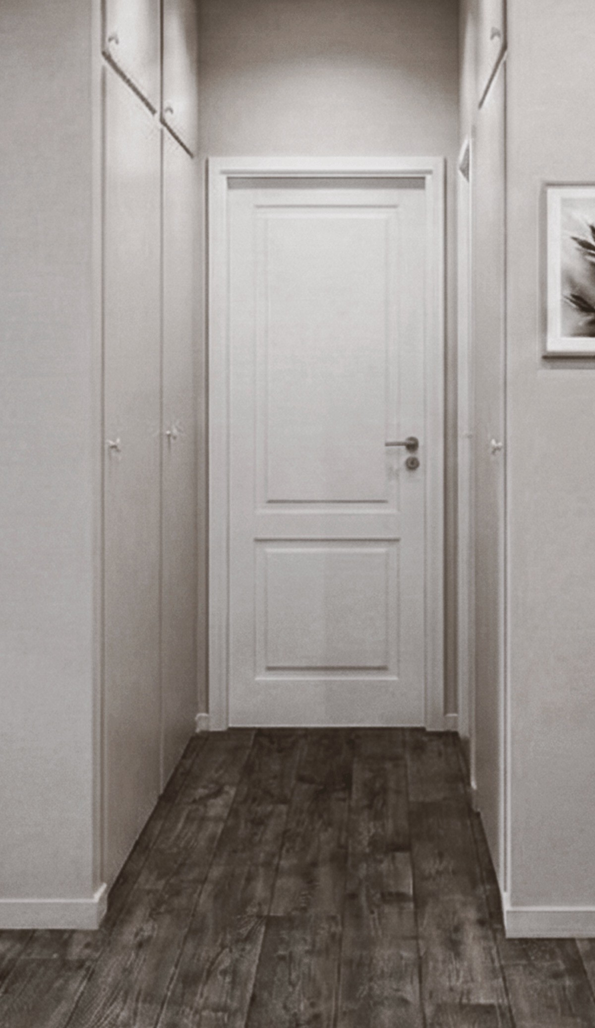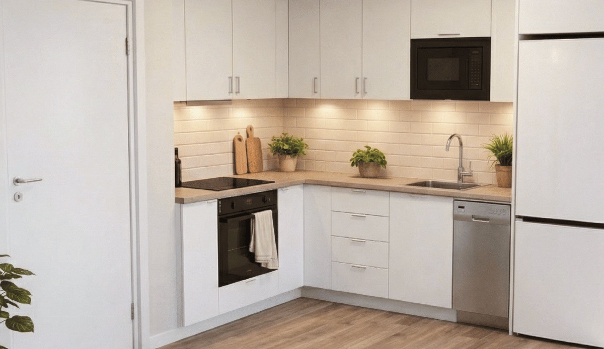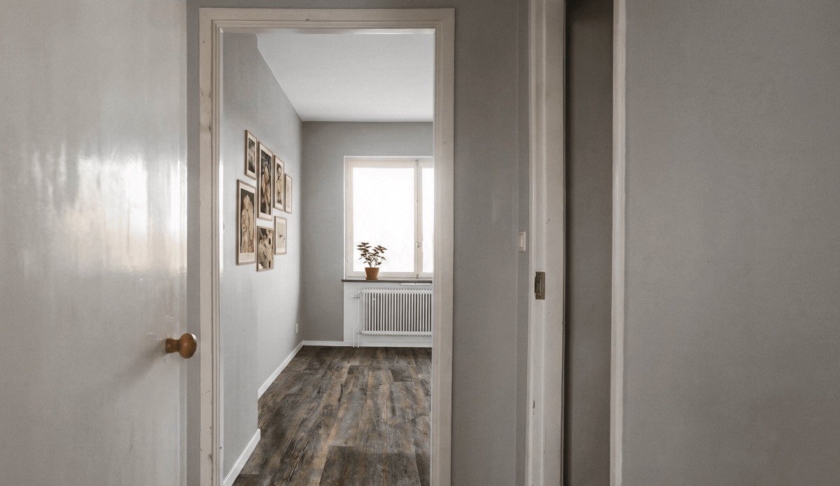 De ljusa väggarna och de enhetliga golven ger ett modernt intryck och skapar en lugn bas för din inredning.